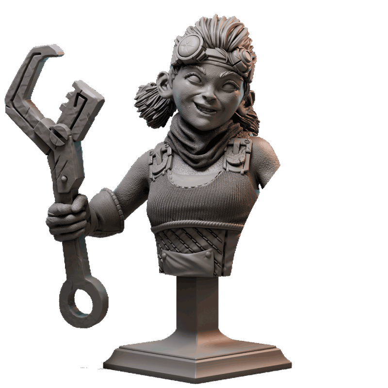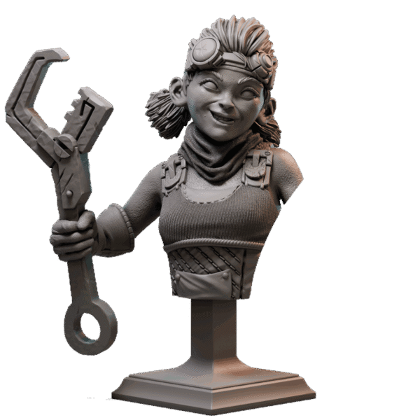 Um busto expressivo que revela a inteligência e o carisma da engenhosa heroína Lilli “Oneshoe” Nackle. A miniatura foca em seu rosto sorridente e seus óculos de proteção. Lilli é retratada segurando sua icônica chave de grifo gigante, demonstrando sua perícia mecânica.