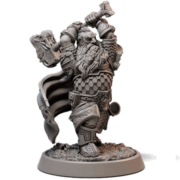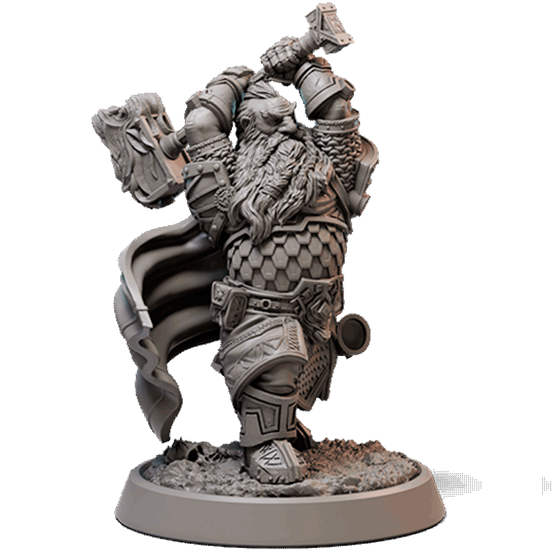 “Ostentando uma postura de força inabalável, Gardain Firebeard é a personificação do anão guerreiro lendário. Esta miniatura detalhada captura um anão robusto e barbudo, adornado com uma armadura pesada que inclui cotas de malha e placas hexagonais, conferindo-lhe uma aparência formidável. Ele empunha dois martelos de guerra massivos, erguidos em um movimento poderoso, sugerindo que ele está prestes a desferir um golpe devastador. Sua barba, longa e trançada, e seu elmo, parcialmente visível, adicionam ao seu caráter imponente e tradicional de anão. Perfeito para liderar o Bright Vanguard na exploração da Tenebris ou para confrontar as ameaças dos Elfos Negros, Gardain Firebeard infunde coragem e determinação em qualquer campanha de RPG.”