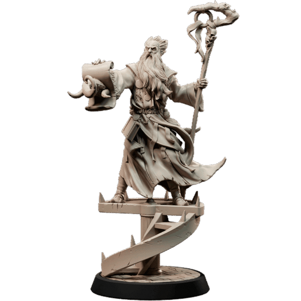 “No topo de sua torre arcana, o Mad Mage (BOSS) é a fonte de toda a bizarria e perigo que agora assola Panshaw. Esta miniatura detalhada captura a essência de um arquimago cujas experiências egoístas distorceram tanto sua mente quanto a realidade ao seu redor. Com sua longa barba esvoaçante, ele empunha um cajado grotesco adornado com crânios, enquanto segura um pergaminho de feitiços proibidos e um orbe pulsante de energia mágica. Sua postura sobre uma plataforma de runas e estacas pontiagudas reflete sua reclusão e a natureza perigosa de seus experimentos. O Mago Louco é o desafio final, um mestre da conjuração descontrolada, cujas criações bizarras são um mero prelúdio para sua própria loucura. Essencial para o clímax de qualquer campanha que explore os limites da magia e o custo da ambição desmedida.