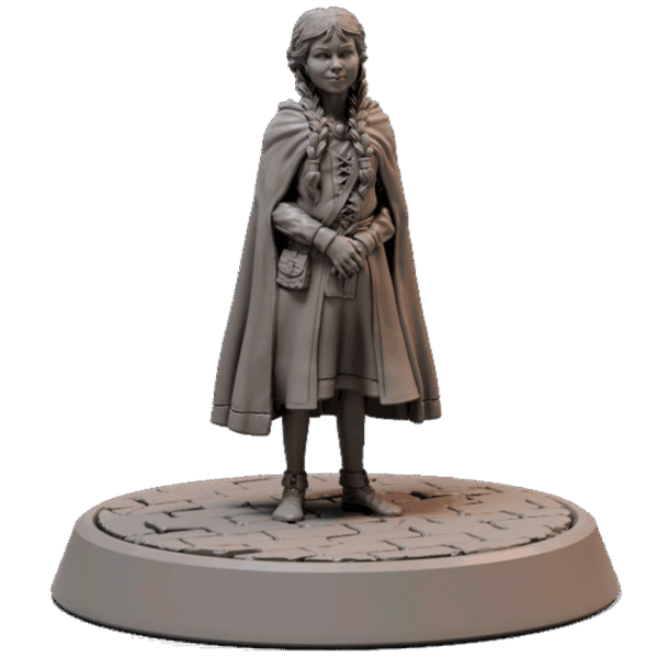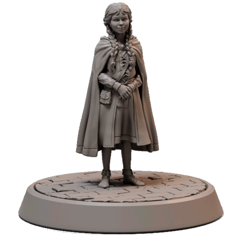 Com uma capa e suas tranças bem feitas, Gretel é uma das crianças centrais nesta narrativa de horror. Esta miniatura detalhada retrata uma jovem em trajes rústicos, com uma capa que confere um ar de mistério e uma pose que sugere timidez ou cautela. A peça evoca a inocência das vítimas potenciais no lar da bruxa.