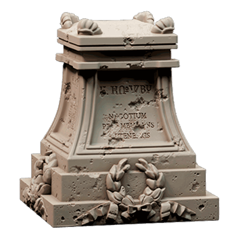 “Um túmulo profanado é um sinal claro da ameaça implacável da Wightpocalypse. A miniatura Grave captura a solidez de um monumento funerário, mas com as marcas do tempo e, possivelmente, da violência que a tirou de seu descanso. Com suas inscrições gravadas e a coroa de louros esculpida na base, ela ecoa a memória dos que um dia repousaram ali, antes que a magia vil do Wight os trouxesse de volta à não-vida. Perfeita para ambientar cemitérios assombrados, campos de batalha recém-profanados ou qualquer local onde a linha entre a vida e a morte foi borrada. A Grave serve como um ponto de cobertura ou um lembrete sombrio da luta contínua contra os mortos-vivos em Panshaw.