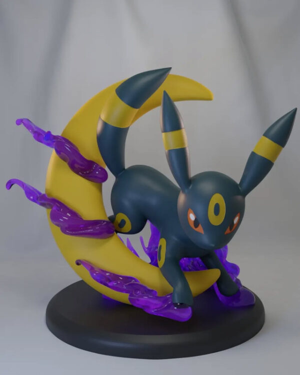“O Umbreon, uma das evoluções do Eevee, é um Pokémon do tipo Sombrio conhecido por sua aparência elegante e por seu anel dourado que brilha na escuridão. Ele é capaz de emitir um suor venenoso de seus poros quando se sente ameaçado. O anel em seu corpo brilha quando a lua está cheia, o que lhe dá um poder especial. Umbreon é um símbolo de mistério e poder sombrio, ideal para treinadores que buscam um parceiro com habilidades para o campo de batalha, que age sob a luz da lua e domina a noite com ataques sombrios.