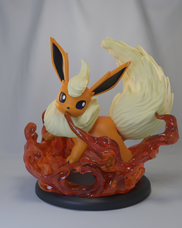 “O Flareon, uma das evoluções do Eevee, é um Pokémon do tipo Fogo conhecido por sua pelagem fofa, que libera calor intenso, e uma bolsa de chamas dentro de seu corpo. Esta miniatura captura a aparência calorosa e a determinação do Flareon, pronto para liberar rajadas de fogo poderosas. Sua temperatura corporal pode chegar a 900°C. Flareon é um símbolo de paixão e força ardente, ideal para treinadores que buscam um parceiro com ataques de fogo devastadores e uma presença marcante no campo de batalha.